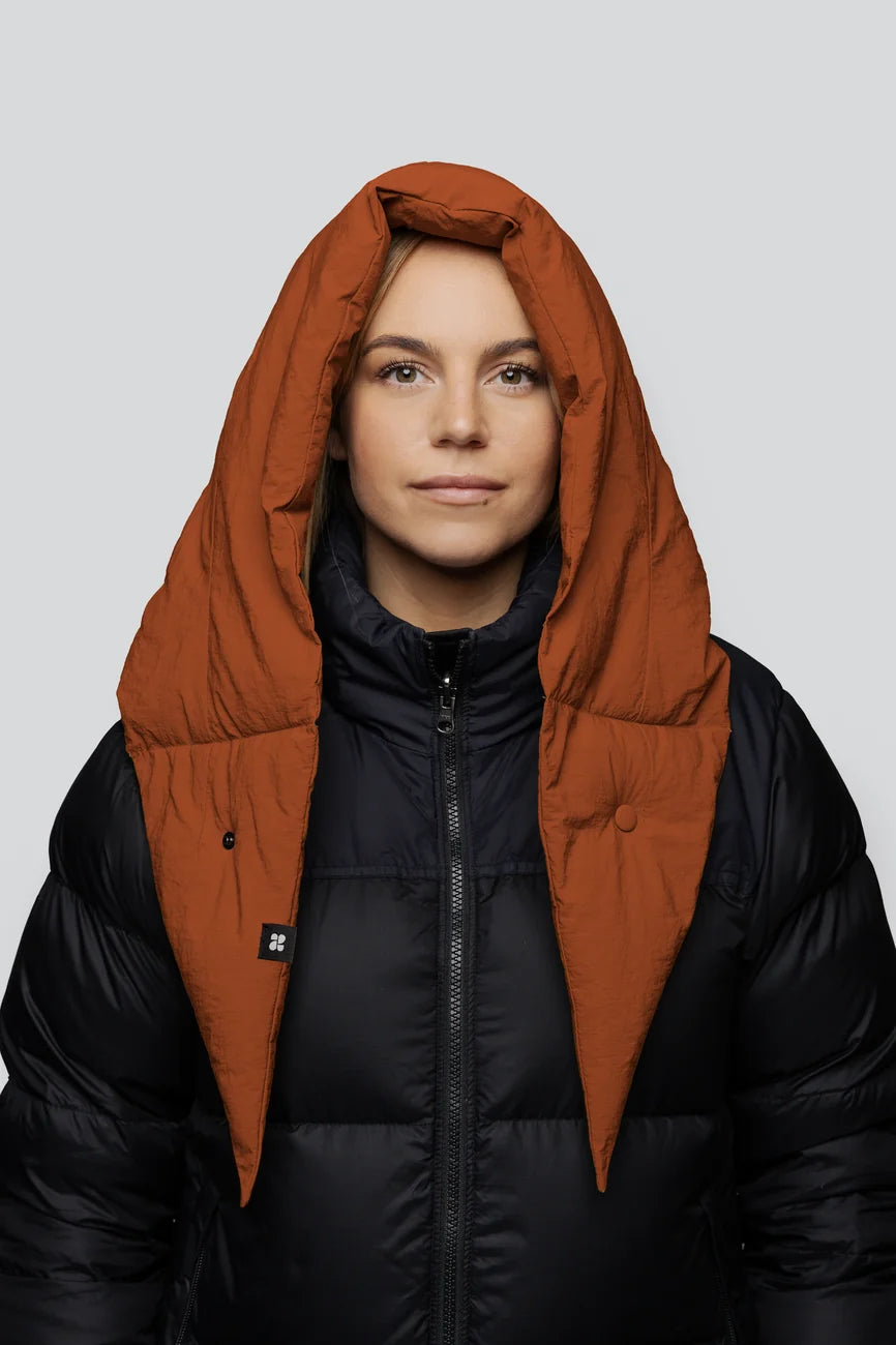 This sustainable beige scarf blends elegant tone with practical warmth. Its vegan down insulation and structured hood keep you protected when the temperature drops. With a detachable strap, it's flexible and cozy – ideal for the Swiss winter.