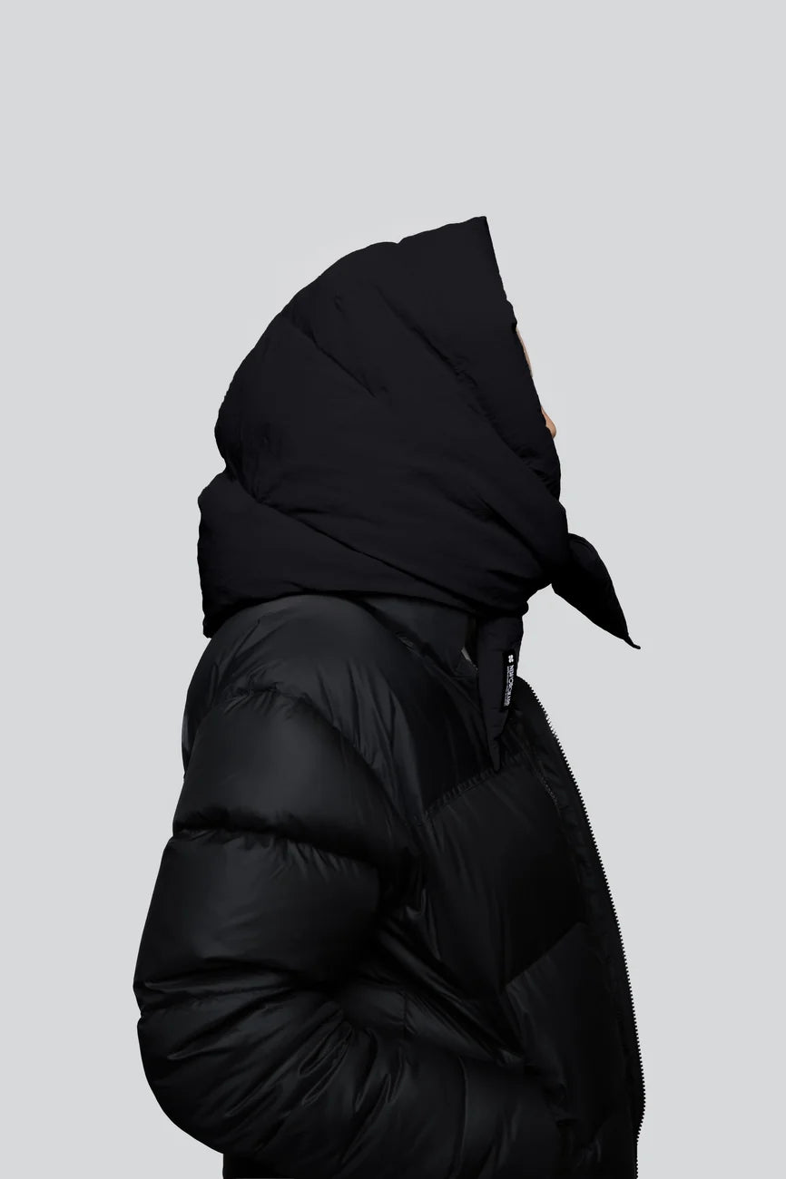 Our capuche (yes, a stylish hood for those chilly days) is as light and fluffy as real down but 100% cruelty-free. Crafted for crisp mountain air and quiet snowfall, this black vegan headscarf merges warmth with precision. The soft vegan down padding shields from wind without overwhelming your silhouette. A sculpted hooded fit and tie under the chin offer flexible ways to wear it – closed for alpine gusts, loosened for sunlit afternoons. Made for Swiss winters, it pairs technical comfort with minimal black design. Durable, water-repellent and grounded in plant-based ethics, it offers cozy calm in snowy cities and mountain villages alike.